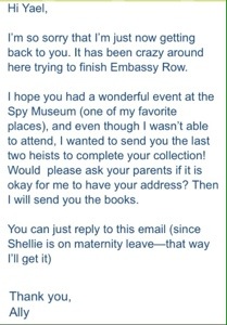You know how I was on that surprise Disney trip? Yeah? Well, when I got home at 1:07 am, my mom told me I had a package and brought it into my room. I knew what it was the second I saw it, and you know, the return address: Carter, Tulsa, OK. Remember my Catch Up post where there was a picture/short article on Ally’s Email ? If not, go read it now, but Ally Carter (my favorite author) wrote to me saying that she was sorry she’d missed my Bat Mitzvah and was going to send me the rest of her books signed to complete my collection! Fangirl moment. You guessed it, the package was the books. I opened it, and there they were, so very perfect, and right on the title page: “Yael, Have a great heist! Ally Carter” (pictured below) I also found a pair of sunglasses just like Kat’s (the main character of the books) with Heist Society on the back, & it was so nice of her to send them to me. Thank you again, Ally, for making my week.